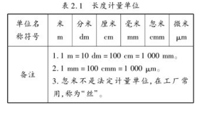 測量就必須有單位,在我國的法定計量單位中,長度的基本單位是米,而在機(jī)械制造企業(yè)中常用的基本長度單位是毫 米。目前,我國常用的長度單位名稱和代號見表2.1。
