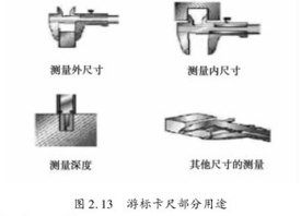 游標卡尺可以測量外尺寸、內尺寸、深度等。如圖2.13 所示。